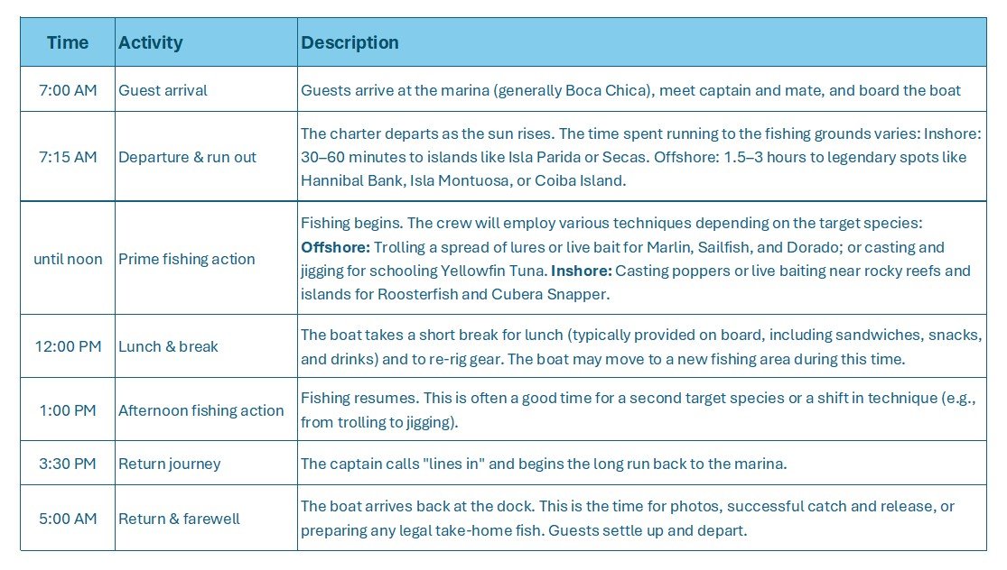 Here is a breakdown of a typical full-day itinerary, which generally starts and ends in Boca Chica: