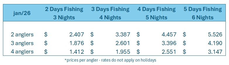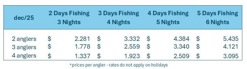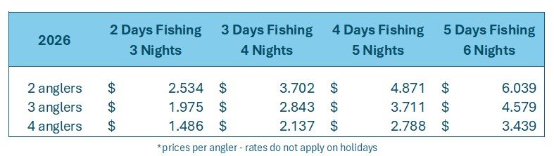 Rates are per angler & do not apply on holidays.